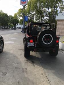 A bright red jeep sped down Orange Ave., a quiet residential street, going 50 MPH or more. Loud exhaust pipes. I was on foot, walking into Los Altos Village. Found him at the service station. Girl in RH seat, driver was young blond boy. Looked like high school kids. I talked with the driver, and he got real mouthy. I told him that street has lots of children. He said it was okay to drive like that because the kids weren't out in the morning. Then he started his jeep and burned rubber as he left the service station, speeding and driving in the oncoming lane of traffic.