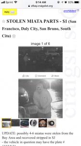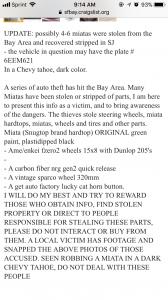 This car was the follow vehicle for multiple car jacking, including my own. 7MEE095. This car (6EEM621) is a black Chevy Tahoe. Please help find my car along with other miatas from these spineless people.