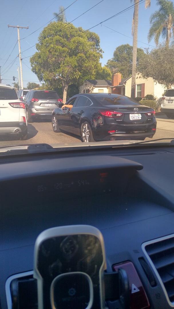 Driver trespassed on driveway to turn around. It is illegal, and unnecessary. Just drive up so that your front wheels cross the sidewalk, then flip around. no need to go all the way up.
